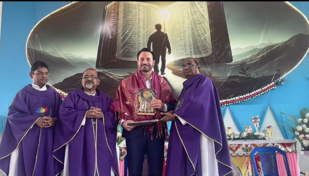 Dustin Plantholt receives the Mary Help of Christians Award, presented by Cardinal Anthony Poola and Bishop Rayarala Vijay Kumar of the Diocese of Srikakulam.